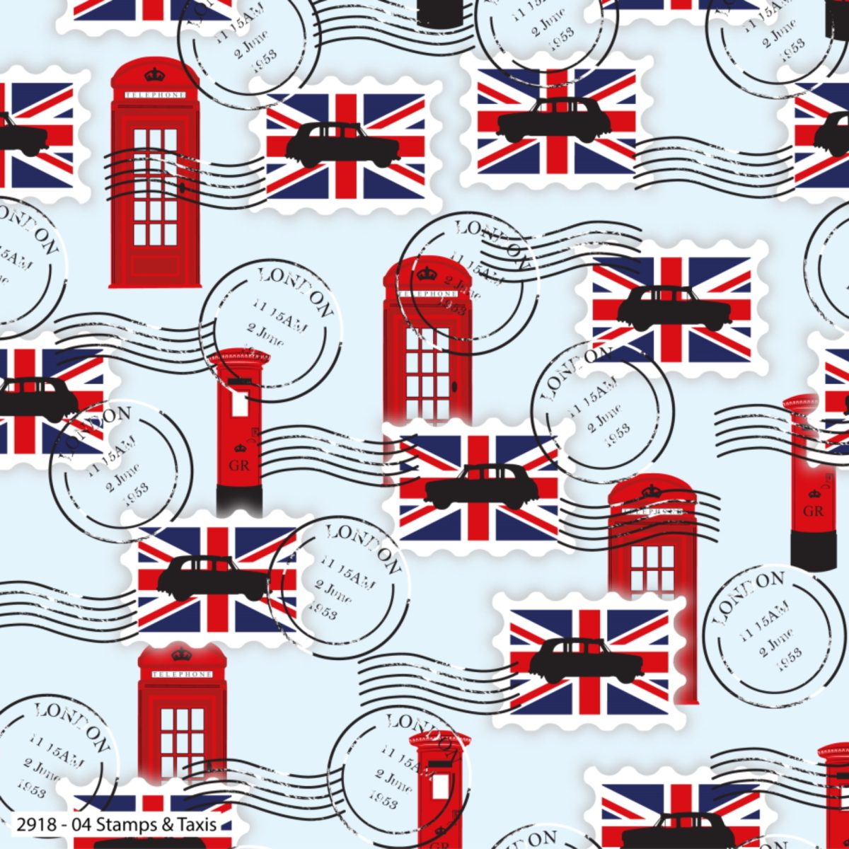 This iconic Stamps & Taxis print from the Craft Cotton Company’s Happy and Glorious collection features Union Jack stamps, London taxis and traditional red phone boxes and postboxes.  It’s an ideal fabric for tablecloths, bunting, aprons, cushions and perfect for quilting, patchwork and craft projects.