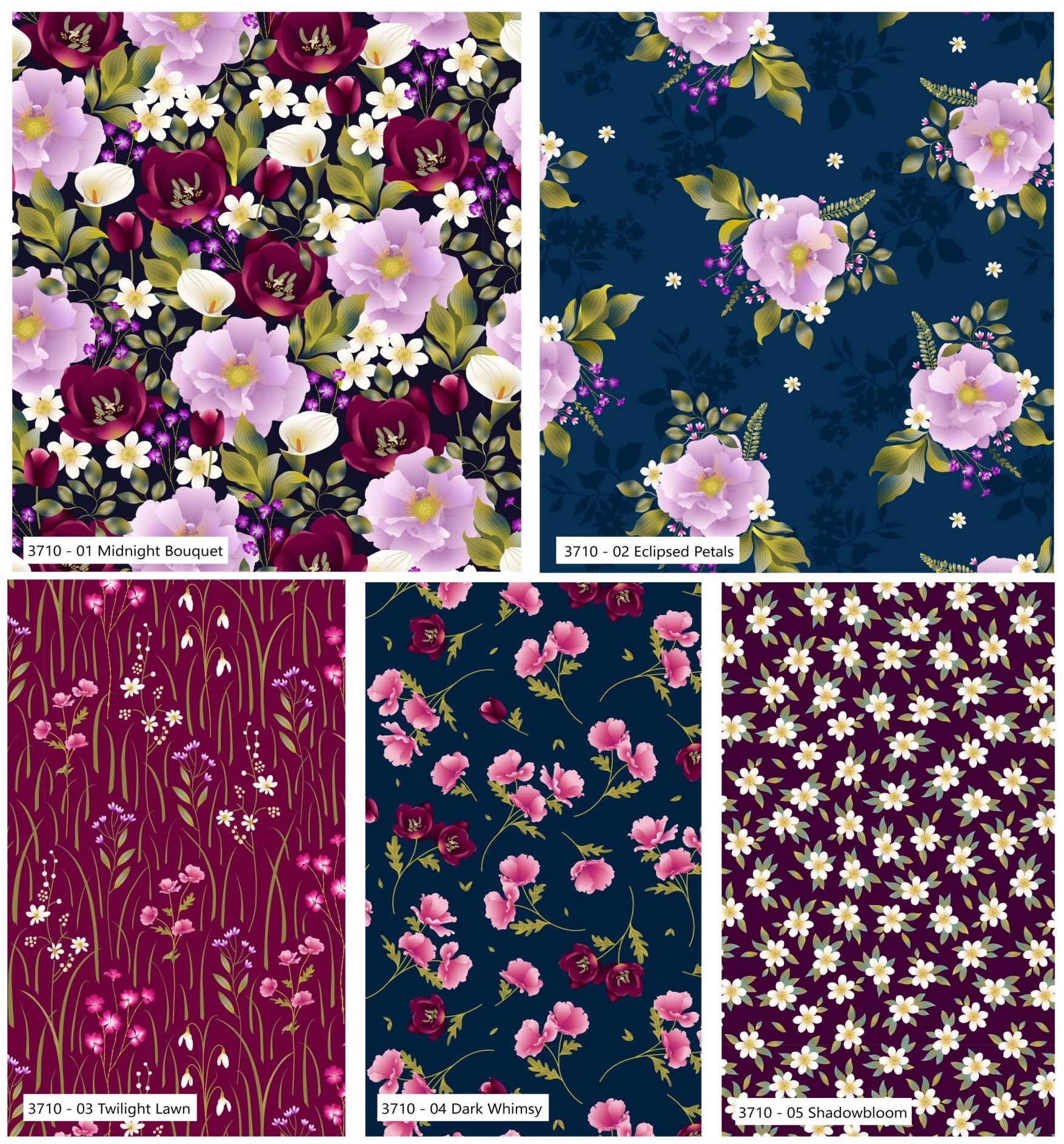 This beautiful set of five co-ordinating 100% cotton fat quarters from the Craft Cotton Company features detailed floral prints on shades of dark navy and deep red, creating striking designs. These are craft quality fabrics, suitable for quilting, patchwork and craft projects.