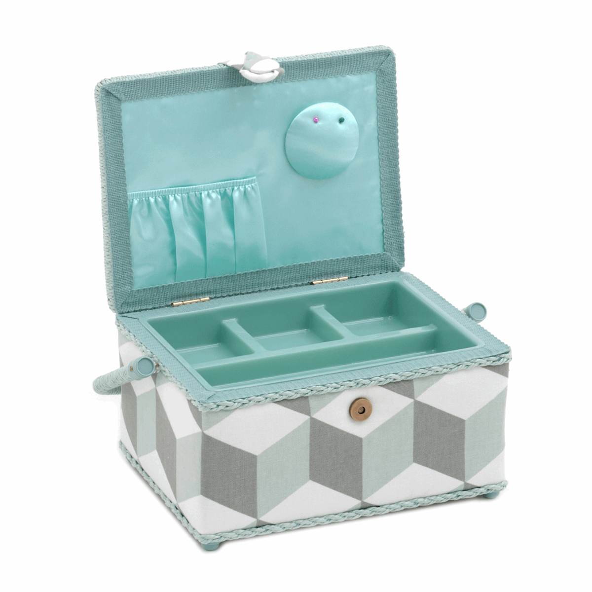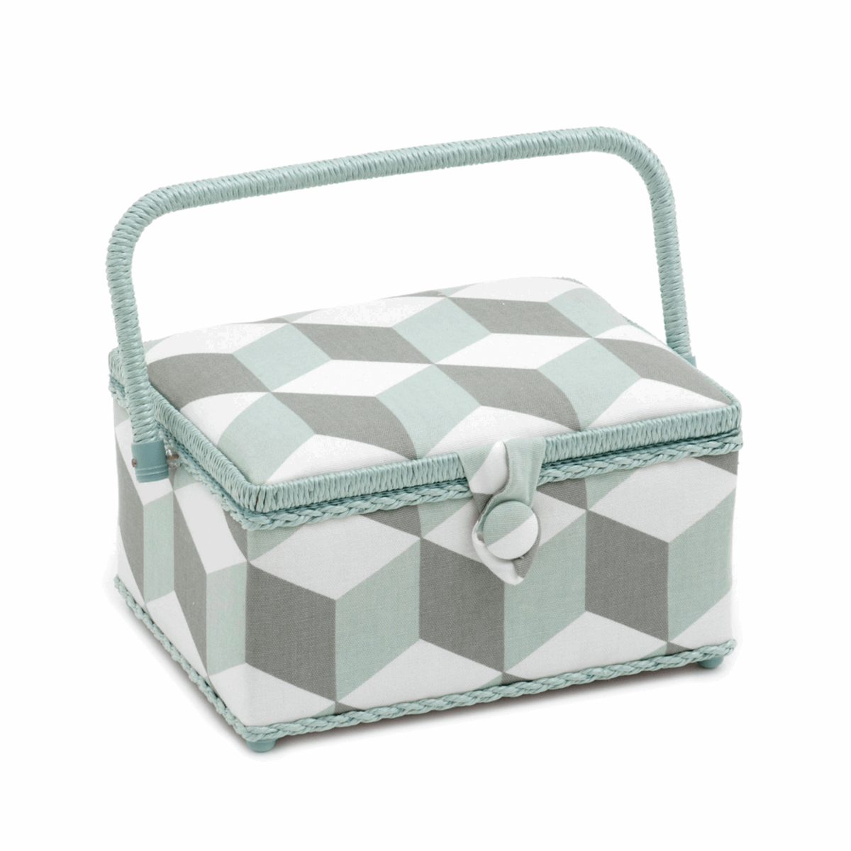 A medium-sized Sewing/Craft Basket to store your essential sewing and craft accessories. The box measures 26 x 18.5 x 15cm; it is covered in 100% cotton fabric with raffia-covered handles. It has an integral plastic tray to hold sewing notions or small craft items, an internal pocket and a small pin cushion on the inside of the lid. A press stud fastening keeps all of your items secure.