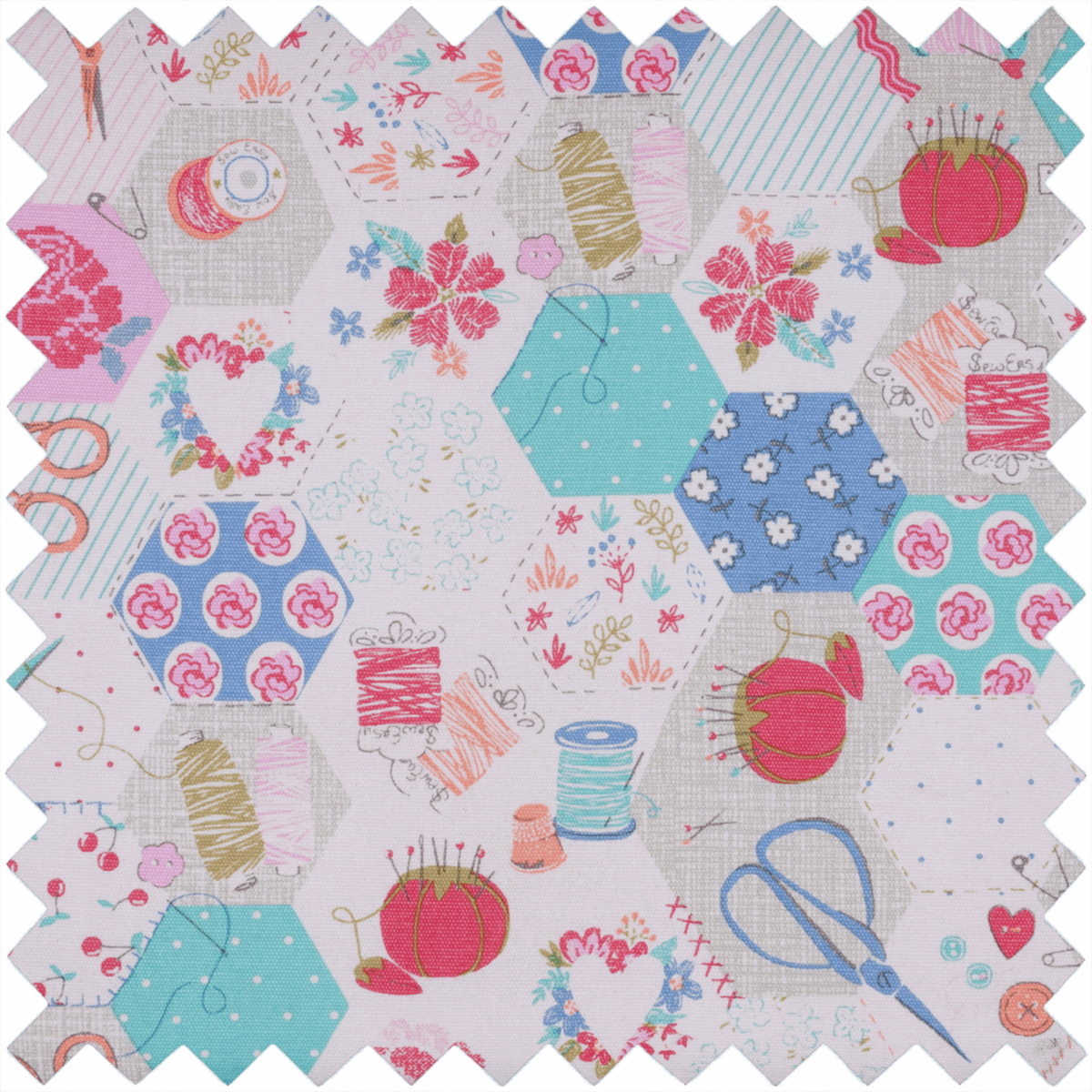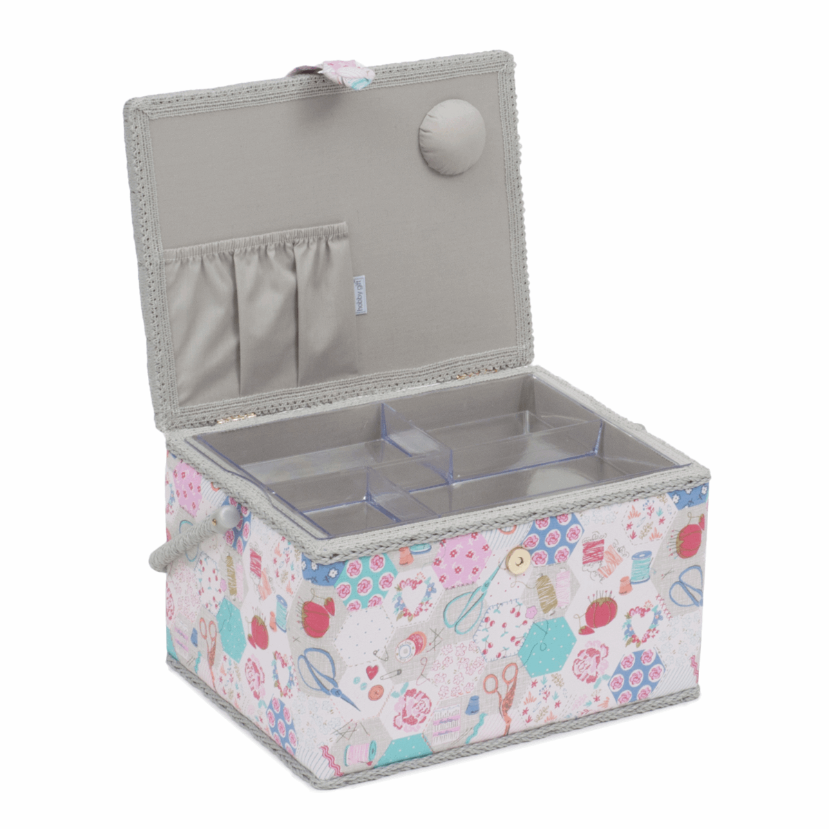 A large Sewing/Craft Basket to store all your essential sewing and craft accessories. The box measures 31 x 23.5 x 20cm; it is covered in 100% cotton fabric with raffia-covered handles. It has an integral plastic tray to hold sewing notions or small craft items, an internal pocket and a small pin cushion on the inside of the lid. A press stud fastening keeps all of your items secure.